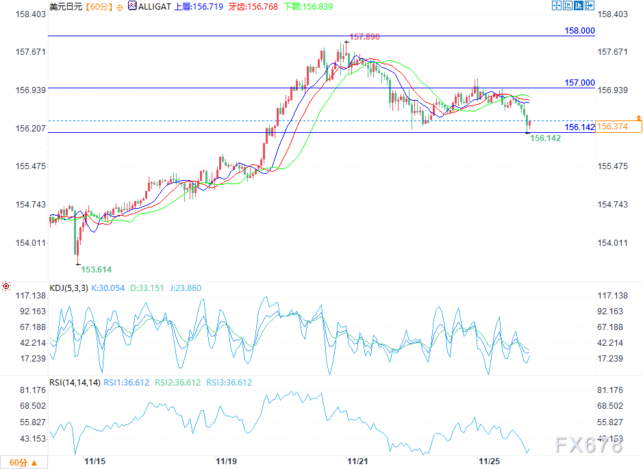 汇通财经APP讯——周二(11月25日)欧盘时段,美元/日元汇率走低,主要因市场猜测日本当局可能采取干预措施支撑本币。美元/日元日内先冲高至157.0附近,随后震荡下行,尾盘下探至156.28的日内低点,整体呈“冲高回落+弱势震荡”格局。