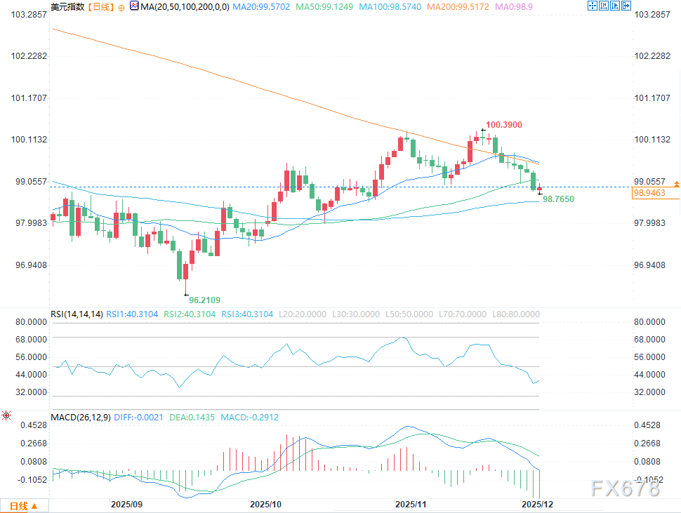 汇通财经APP讯——周四(12月4日)美盘时段,美元指数先急跌触日内低位,随即快速反弹,维持震荡偏强走势,盘中报98.9624,涨幅0.10%。美元指数周三未能守住50日均线99.122的支撑位(目前已成为多头反攻的关键阻力),进一步加剧下行动能。随着市场对美联储下周降息的预期升温,且关于鲍威尔可能由更鸽派人士接任的猜测愈演愈烈,交易员可能加速抛售美元。